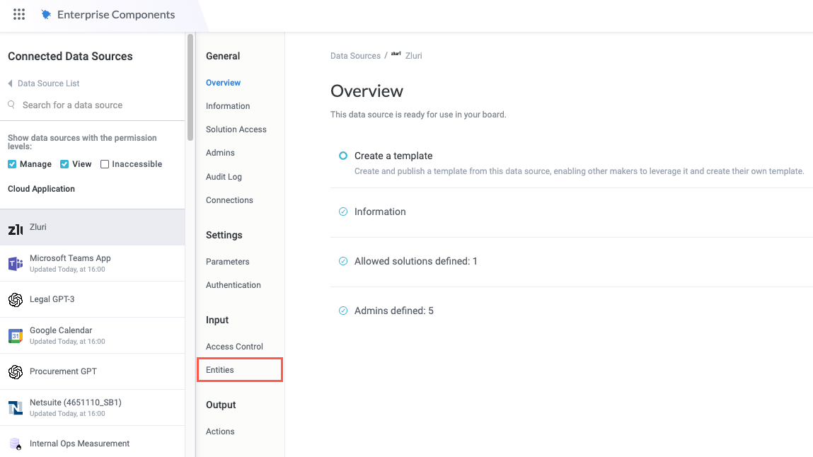 In the data source configuration panel, select Entities. The Entities screen displays.